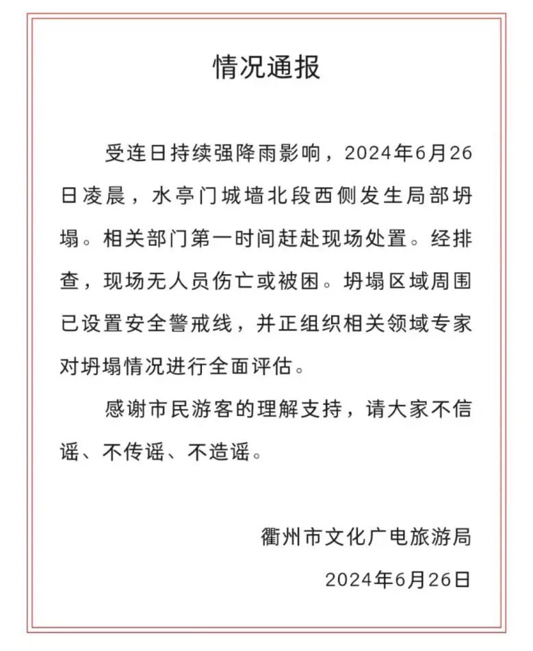 6月26日上午9时38分,衢州市文化广电旅游局发布关于衢州水亭门城墙北段西侧发生局部坍塌情况通报:2024年6月26日凌晨,水亭门城墙北段西侧发生局部坍塌。相关部门第一时间赶赴现场处置。经排查,现场无人员伤亡或被困。坍塌区域周围已设置安全警戒线,并正组织相关领域专家对坍塌情况进行全面评估。