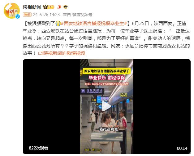 6月25日,陕西西安。正值毕业季,西安地铁在站台通过语音播报,为每一位毕业学子送上祝福:“一路抵达终点,转向又是起点。每一次别离,都是为了更好的重逢”。甜美动人的话语,播撒出西安城对所有莘莘学子的祝福和温暖。网友:永远会记得韦曲南到西安北站的故事!