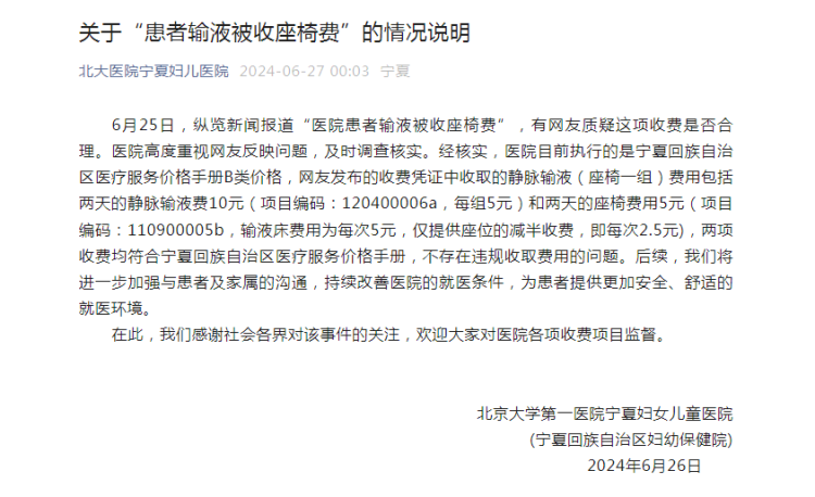 6月25日,纵览新闻报道“医院患者输液被收座椅费”,有网友质疑这项收费是否合理。医院高度重视网友反映问题,及时调查核实。经核实,医院目前执行的是宁夏回族自治区医疗服务价格手册B类价格,网友发布的收费凭证中收取的静脉输液(座椅一组)费用包括两天的静脉输液费10元(项目编码:120400006a,每组5元)和两天的座椅费用5元(项目编码:110900005b,输液床费用为每次5元,仅提供座位的减半收费,即每次2.5元),两项收费均符合宁夏回族自治区医疗服务价格手册,不存在违规收取费用的问题。后续,我们将进一步加强与患者及家属的沟通,持续改善医院的就医条件,为患者提供更加安全、舒适的就医环境。