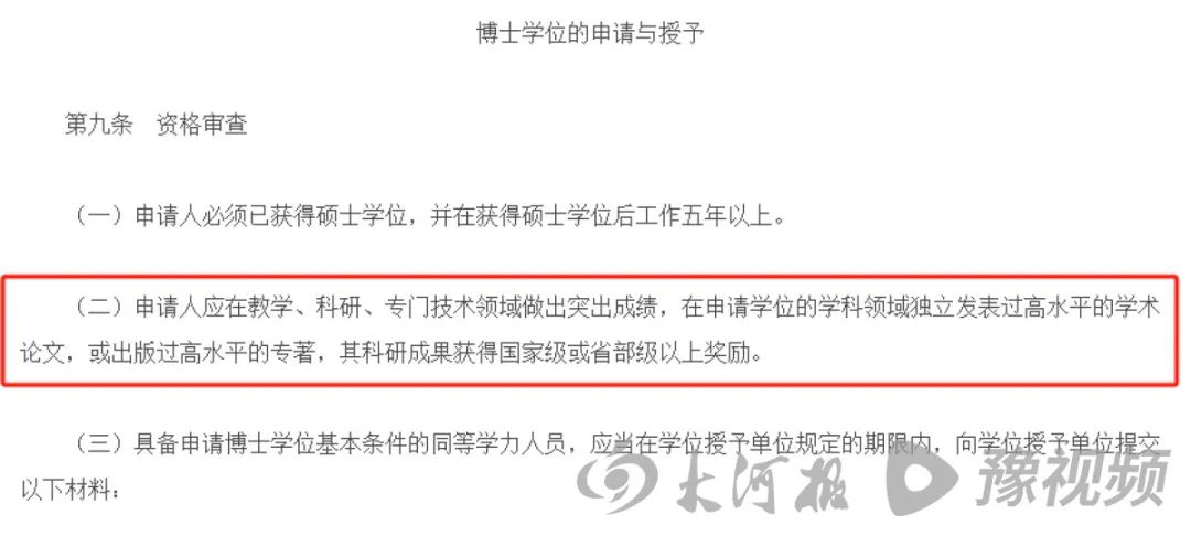 据了解,此次中国医科大学更改政策的依据是1998年发布的《国务院学位委员会关于授予具有研究生毕业同等学力人员硕士、博士学位的规定》,其中“博士学位的申请与授予”第九条“资格审查”规定:申请人应在教学、科研、专门技术领域做出突出成绩,在申请学位的学科领域独立发表过高水平的学术论文,或出版过高水平的专著,其科研成果获得国家级或省部级以上奖励。