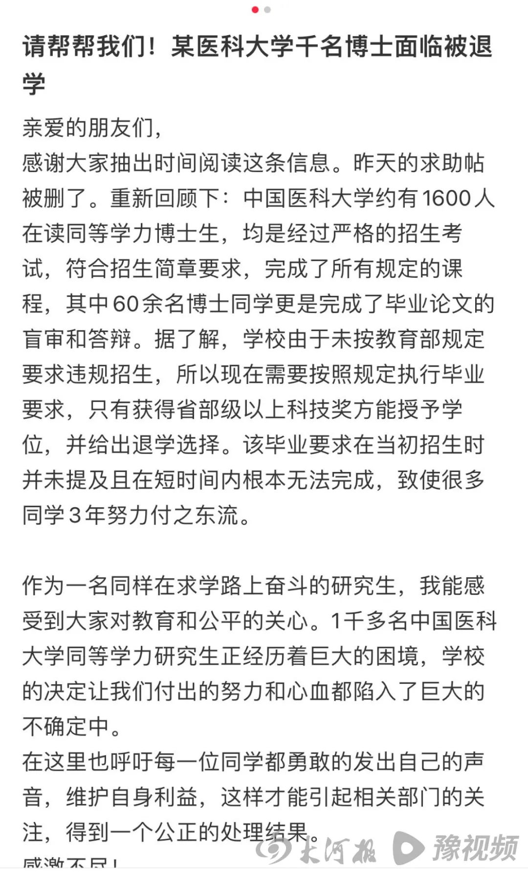 近日,一名自称中国医科大学博士研究生在网上发布的求助信引发关注,其称中国医科大学多名在读博士面临被劝退,其中有博士已完成毕业论文的盲审和答辩。目前,在某平台上的该帖文已被删除。据媒体报道,6月26日,辽宁省教育厅工作人员称,已成立工作专班正在核实处理此事。