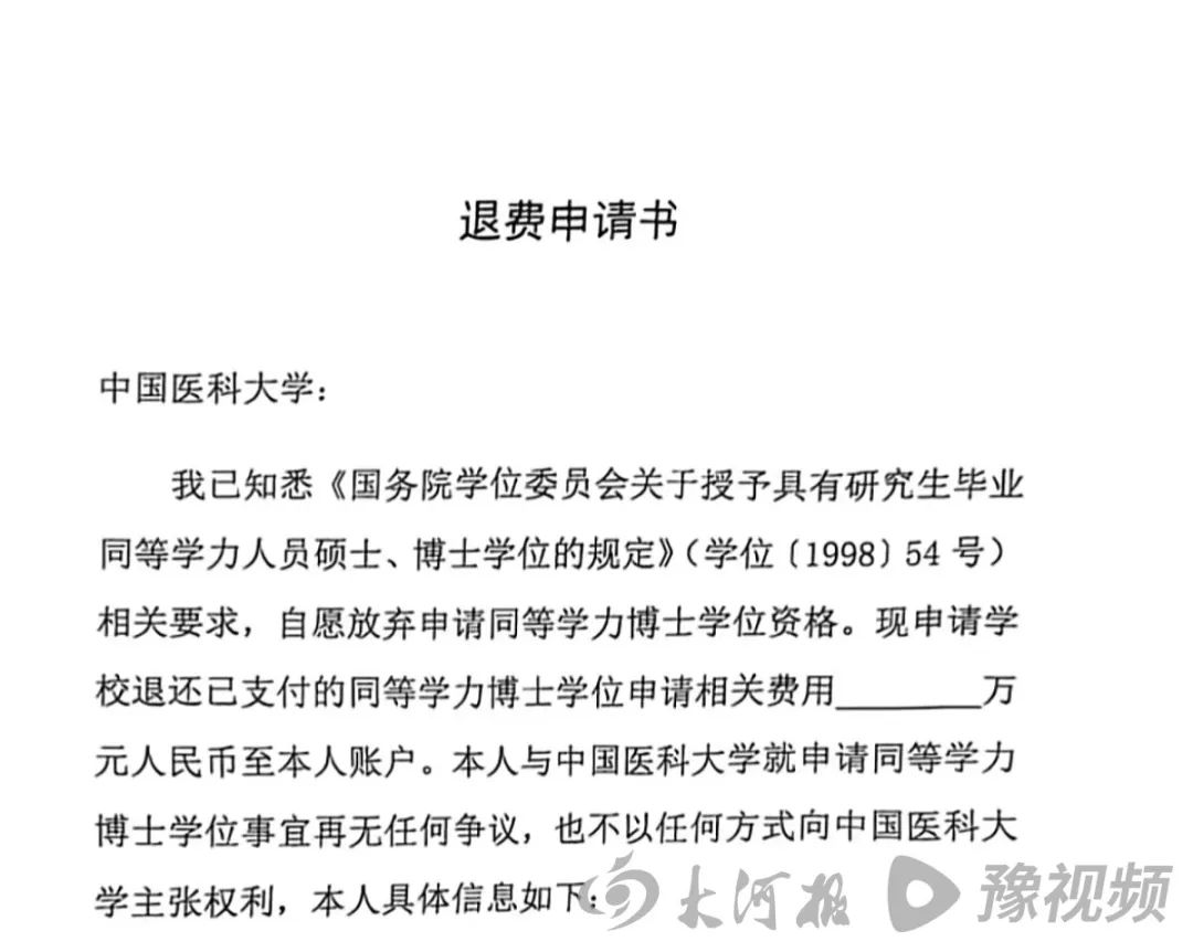 据网传的“退费申请”,学生“自愿放弃申请同等学力博士学位资格”,可向学校申请退还已支付的相关费用。
