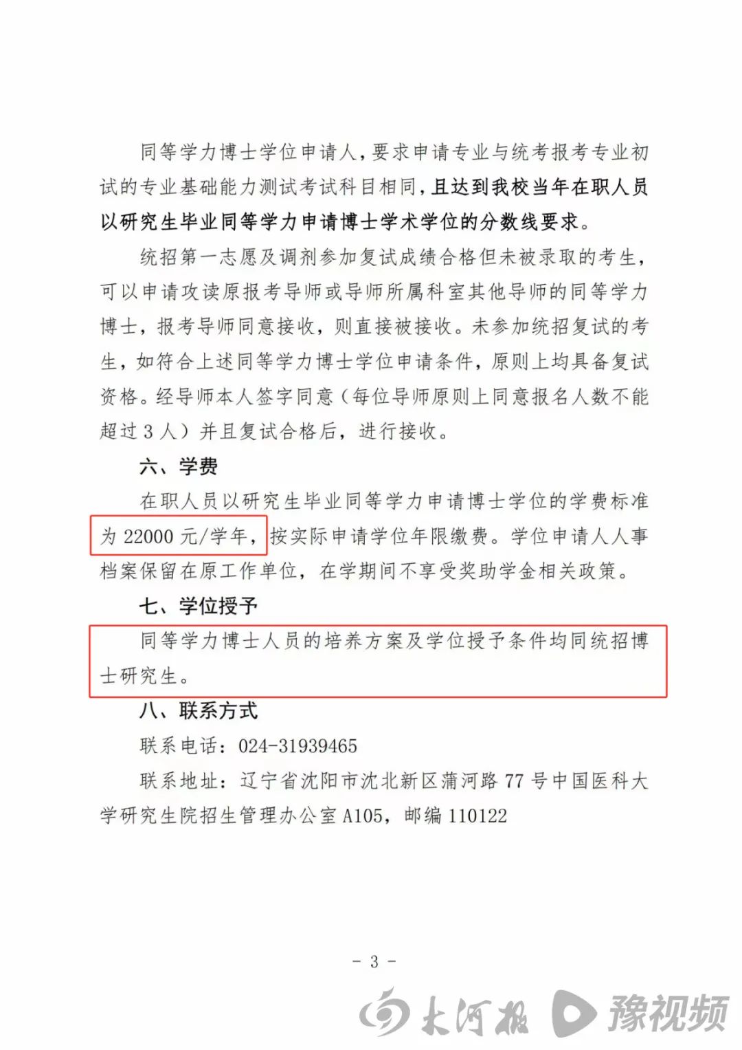 根据李树生提供的《中国医科大学2022年接收在职人员以研究生毕业同等学力申请博士学术学位章程》(以下简称《章程》)第七条显示,同等学力博士人员的培养方案及学位授予条件均同统招博士研究生。“但是现在,对统招的博士及连读的博士都没有要求省部级科技进步奖,却对同等学力博士提出了更高的毕业要求。”