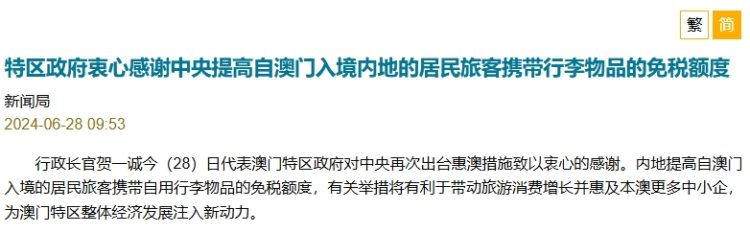 澳门特区行政长官贺一诚28日代表澳门特区政府对中央再次出台惠澳措施致以衷心的感谢。内地提高自澳门入境的居民旅客携带自用行李物品的免税额度,有关举措将有利于带动旅游消费增长并惠及澳门更多中小企,为澳门特区整体经济发展注入新动力。