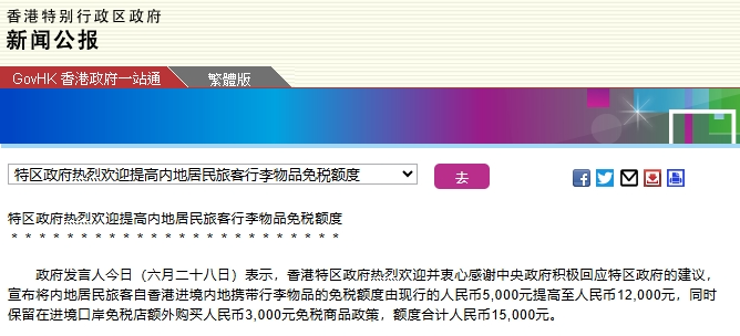 香港特区政府发言人28日表示,香港特区政府热烈欢迎并衷心感谢中央政府积极回应特区政府的建议,宣布将内地居民旅客自香港进境内地携带行李物品的免税额度由现行的人民币5000元提高至人民币12000元,同时保留在进境口岸免税店额外购买人民币3000元免税商品政策,额度合计人民币15000元。