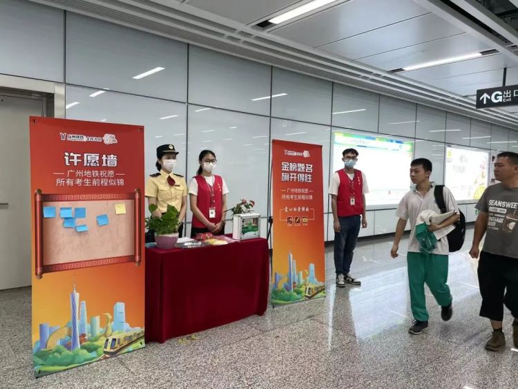 广州地铁8号线陈家祠站是靠近考点广州市第四中学高中部锐园校区的地铁站,记者在现场发现,不少身穿校服的学生赶赴考场。靠近考场的F出口,地铁站点也摆设了爱心摊位,为考生免费提供文具等。