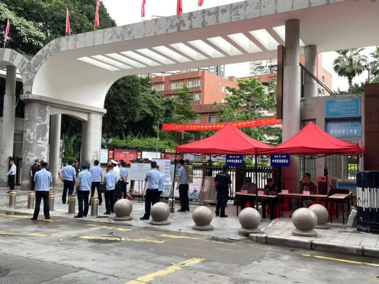 记者看到,在广州市第四中学高中部锐园校区考点校门外架设有5个帐篷,其中1个是中考现场指挥点、1个是中考考生服务点、3个是家长休息区。