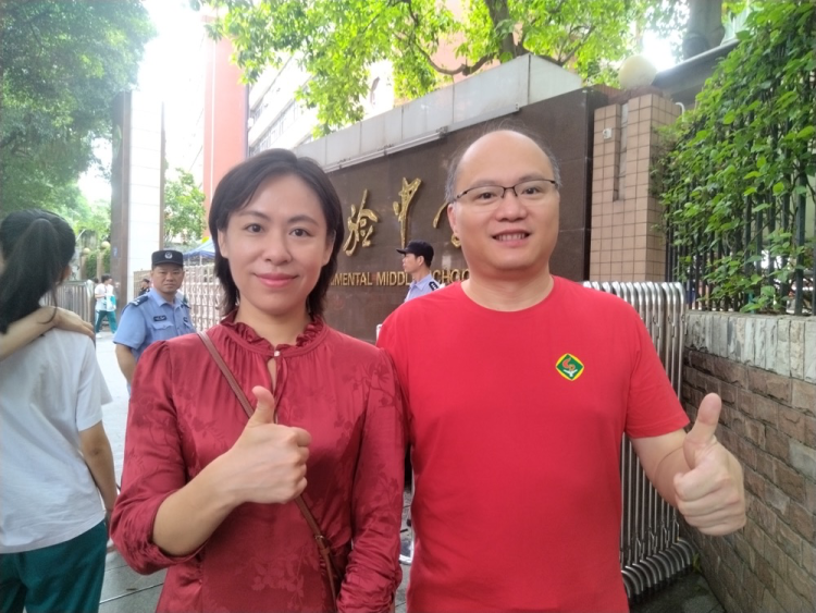 在广东实验中学外,家长罗先生和妻子前来送考,两人心态松弛。他们表示孩子的心态比较放松,自己也并未给孩子太大压力,顺其自然发挥就好。