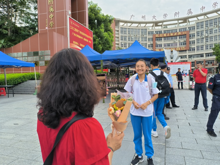 在广州大学附属中学考场外,曹女士今日穿着红衣为孩子送考,她为孩子准备了一束向日葵花束,寓意“一举夺魁”。