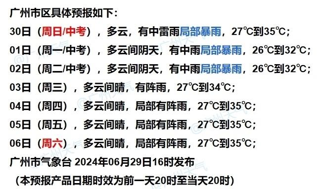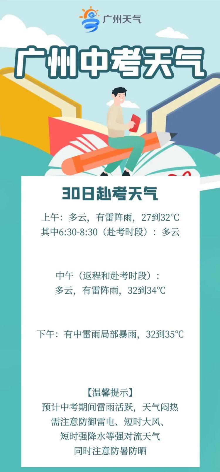 6月29日,广州市气象部门对2024年广州中考期间(6月30日至7月2日)天气进行会商。根据会商预报结论,“雨热同期”将是中考期间广州天气主题。 气象部门提醒考生、家长、考务人员做好对炎热和风雨天气的防御。