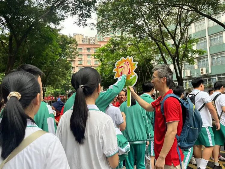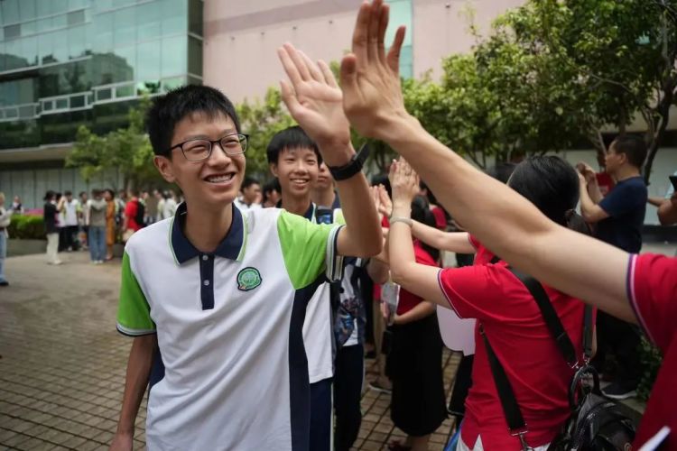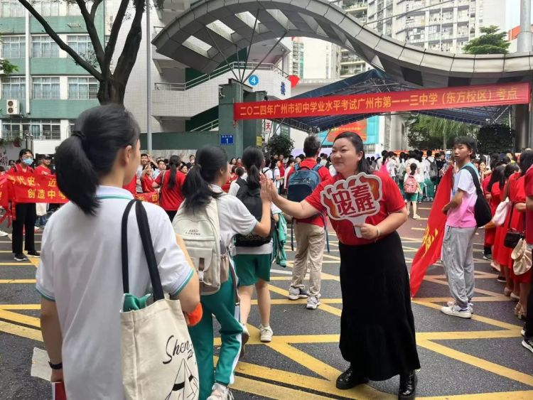 广州市第一一三中学外,考生们与老师击掌,信心十足步入考场