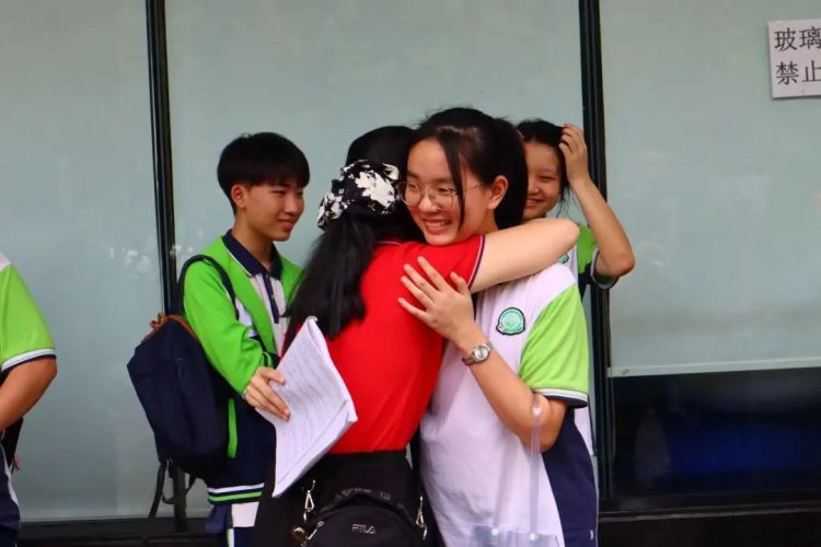 老师和学生们在华南师范大学附属中学考场外拥抱