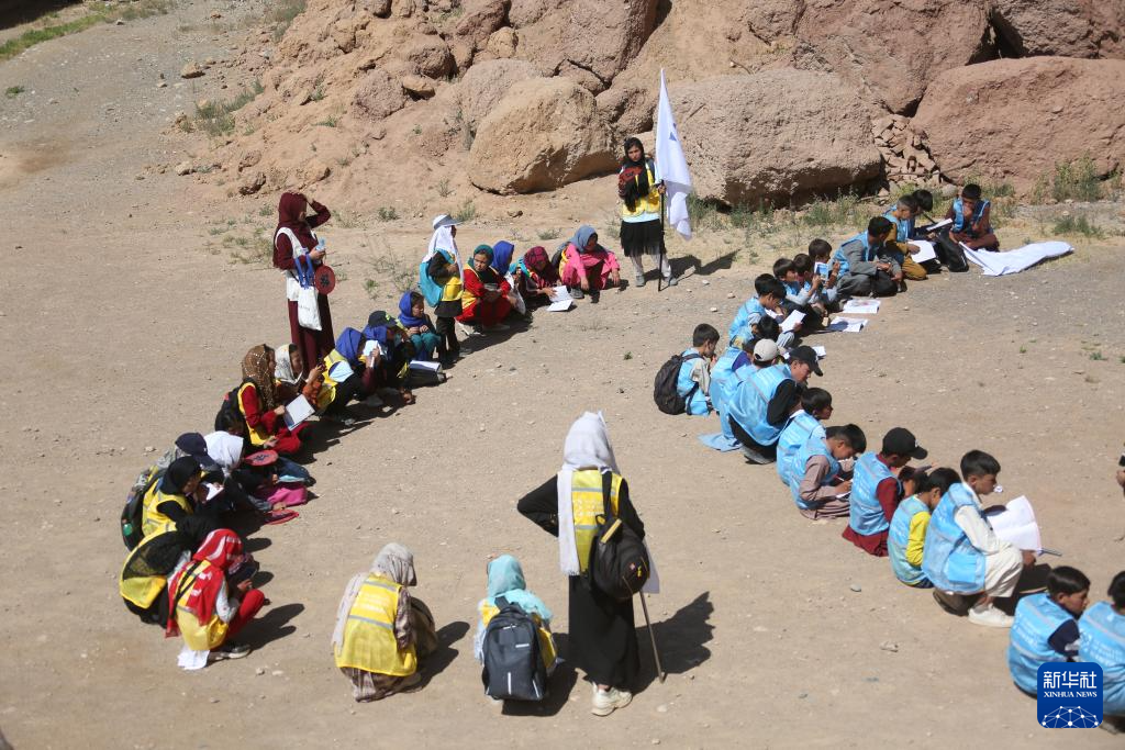 6月15日,在阿富汗巴米扬省的巴米扬大佛遗址区,当地儿童参加“馕课”。新华社发(塞夫拉赫曼·萨菲摄)