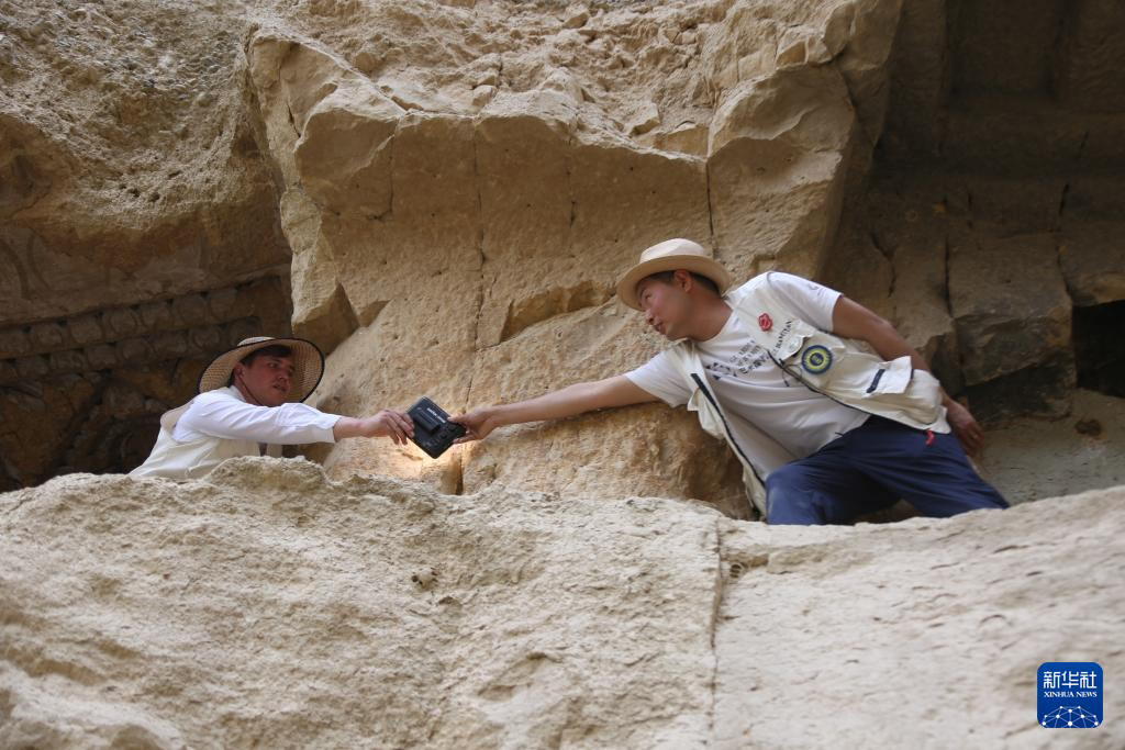 6月15日,在阿富汗巴米扬省的弗拉迪石窟遗址区,中国学者邵学成(左)与当地工作人员一同进行考古工作。新华社发(塞夫拉赫曼·萨菲摄)