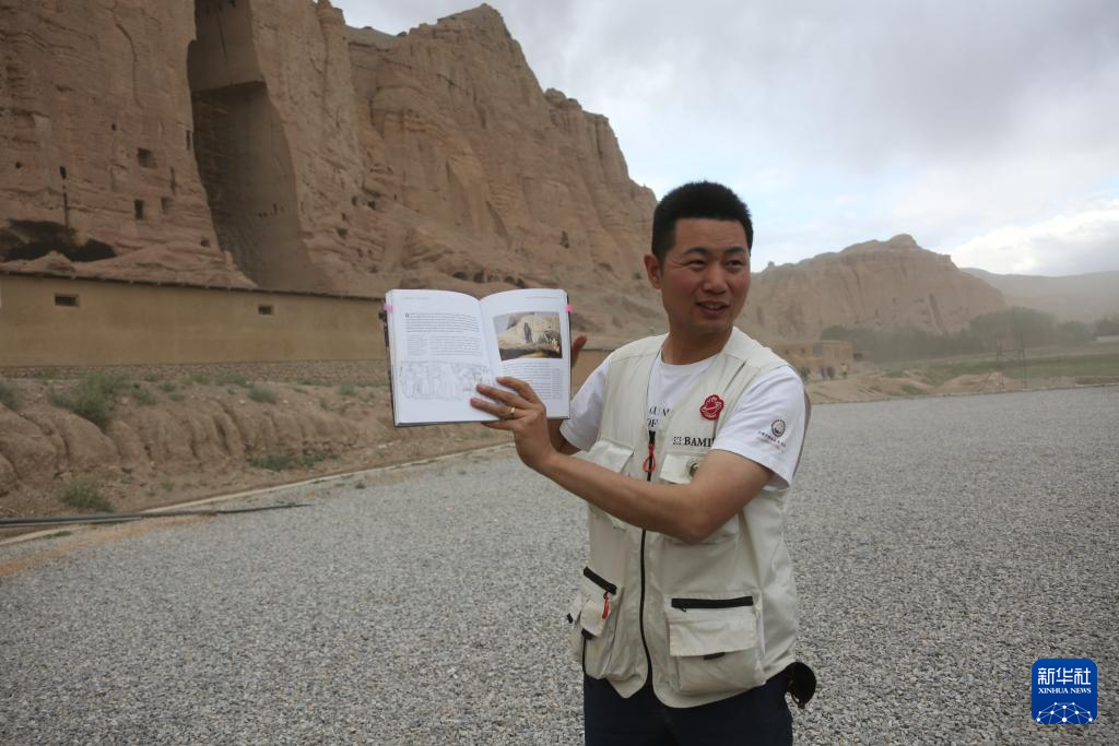 6月15日,在阿富汗巴米扬省的巴米扬大佛遗址区,中国学者邵学成展示书中记载的巴米扬大佛相关内容。新华社发(塞夫拉赫曼·萨菲摄)