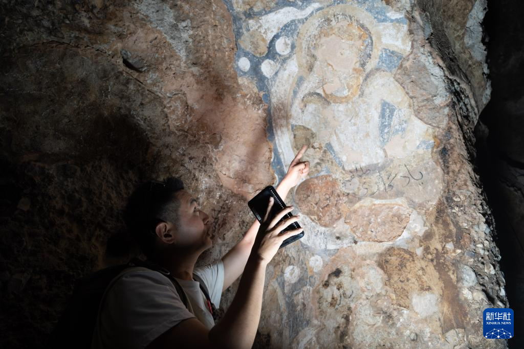 6月15日,在阿富汗巴米扬省,中国学者邵学成在一处石窟中观察壁画。新华社记者 赵家淞 摄