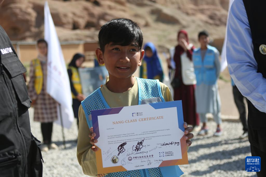 6月16日,在阿富汗巴米扬省的巴米扬大佛遗址区,参加“馕课”的当地学生穆罕默德·扎伊德展示荣誉证书。新华社发(塞夫拉赫曼·萨菲摄)