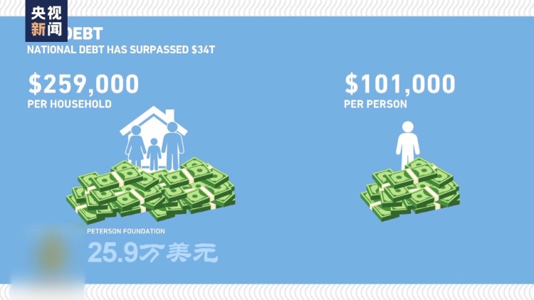 而根据美国彼得森基金会的测算,这34.73万亿美元的联邦债务相当于每个美国家庭负债25.9万美元,每个美国人负债10.1万美元。如果想还清这笔钱,相当于每个美国家庭每月拿出1000美元,连续还款22年。