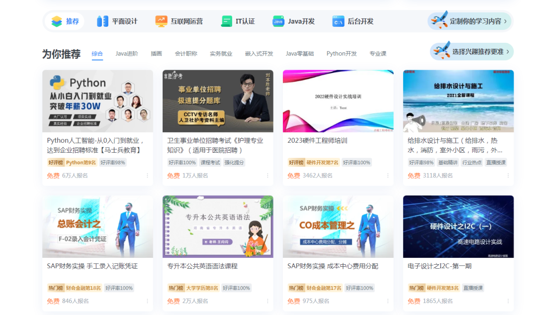 据悉,目前腾讯课堂官网仍有多个免费课程获得了超万人报名参加,涉及Python人工智能、考研英语强化提分、初级会计职称考试等诸多课程。