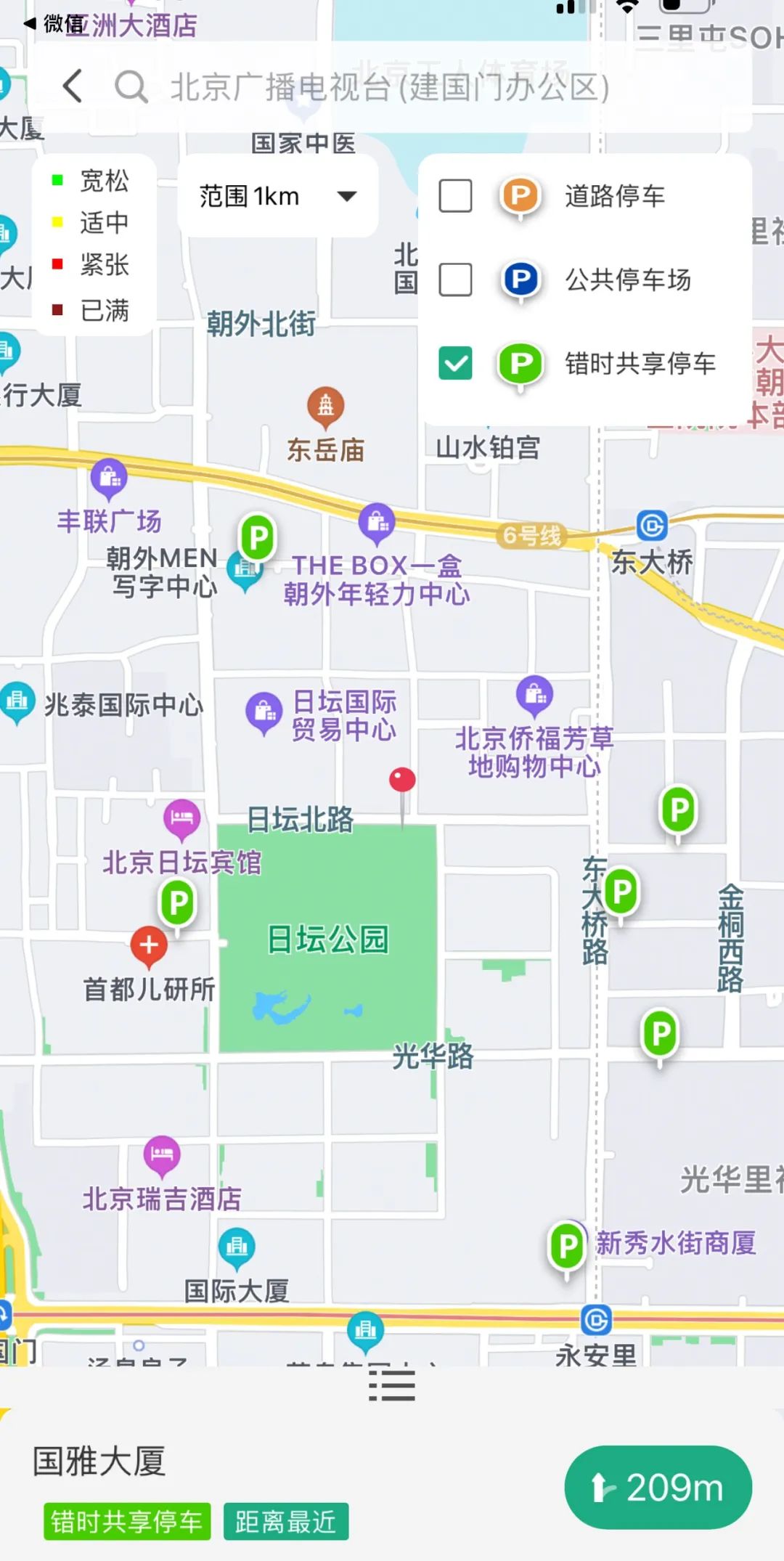 市民朋友可以在“北京交通”APP“停车服务”的地图查询功能中,可以看到“错时共享停车”专题图层,在地图右上角勾选“错时共享停车”,可看到自己所在位置周边默认一公里范围内的有偿错时共享停车场。