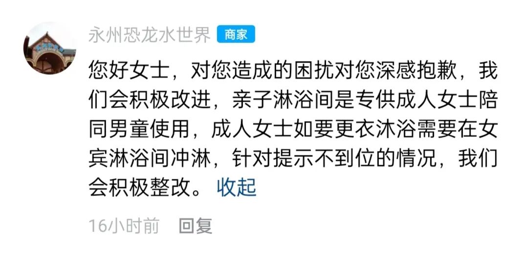 7月1日上午,永州恐龙水世界的工作人员王女士称,景区提供的亲子淋浴间仅供成人女士陪同男童更衣沐浴使用,(没有标示清楚)属于景区提示不到位。