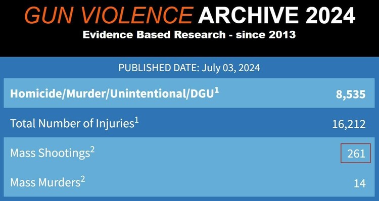 美国“枪支暴力档案”网实时更新数据显示,今年截至当地时间7月3日的仅半年多时间里,全美已经发生261起大规模枪击事件。