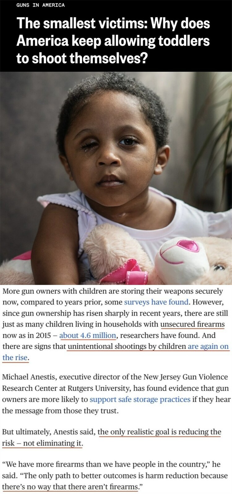 “我们拥有的枪支比我们的人口还多……寻求更好结果的唯一途径只能是尽量减少枪支伤害,因为让这个国家放弃枪支是不可能的。”