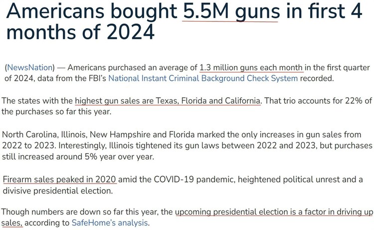 分析认为,即将到来的总统大选是推动枪支购销两旺的重要因素。此前美国枪支销售在2020年达到顶峰,就是缘于总统选举引发的政治分裂和社会动荡。