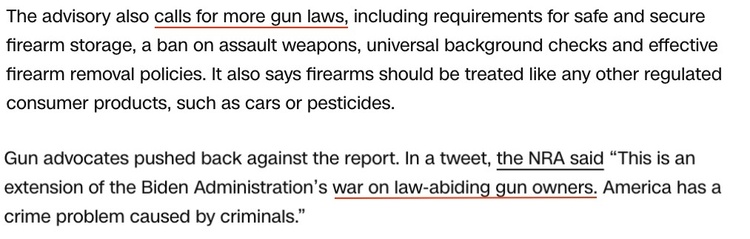 美国最大的拥枪游说组织“全国步枪协会”就嚣张地回应称,公共卫生局的报告只不过是拜登政府“针对合法拥枪者的战争的延伸,造成美国犯罪问题的是罪犯而不是枪”。
