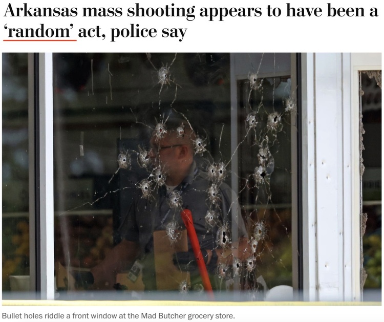 △《华盛顿邮报》:阿肯色州一家超市近日发生枪击事件造成4死10伤。当地警方称,这起枪击事件是“完全随机的行为”。