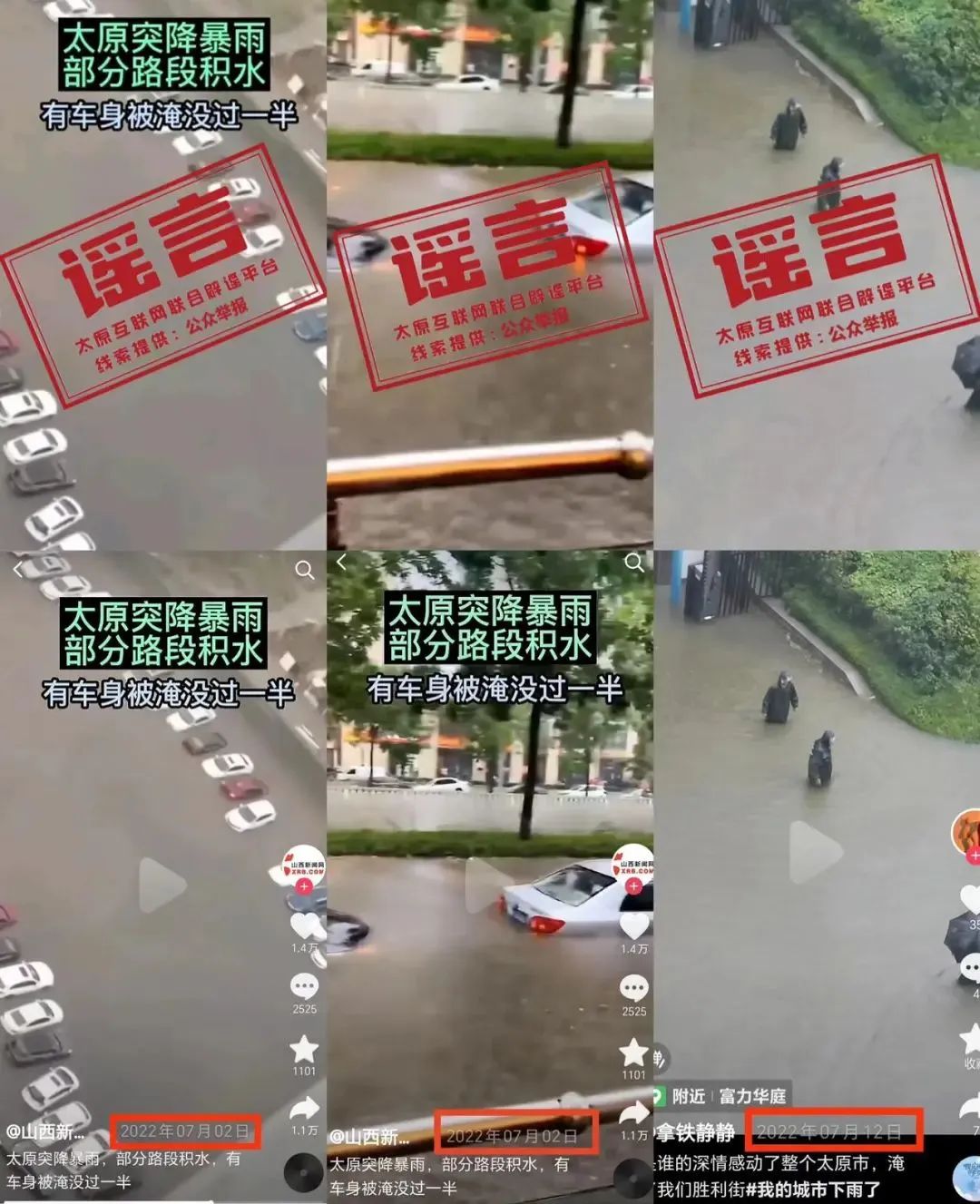 经核实,该信息中的前三张图片均为2022年太原市部分路段积水图片,该信息属于典型的旧事冷饭热炒、新闻嫁接拼凑。网信部门已将谣言线索移交公安机关,将依法依规进行处理。