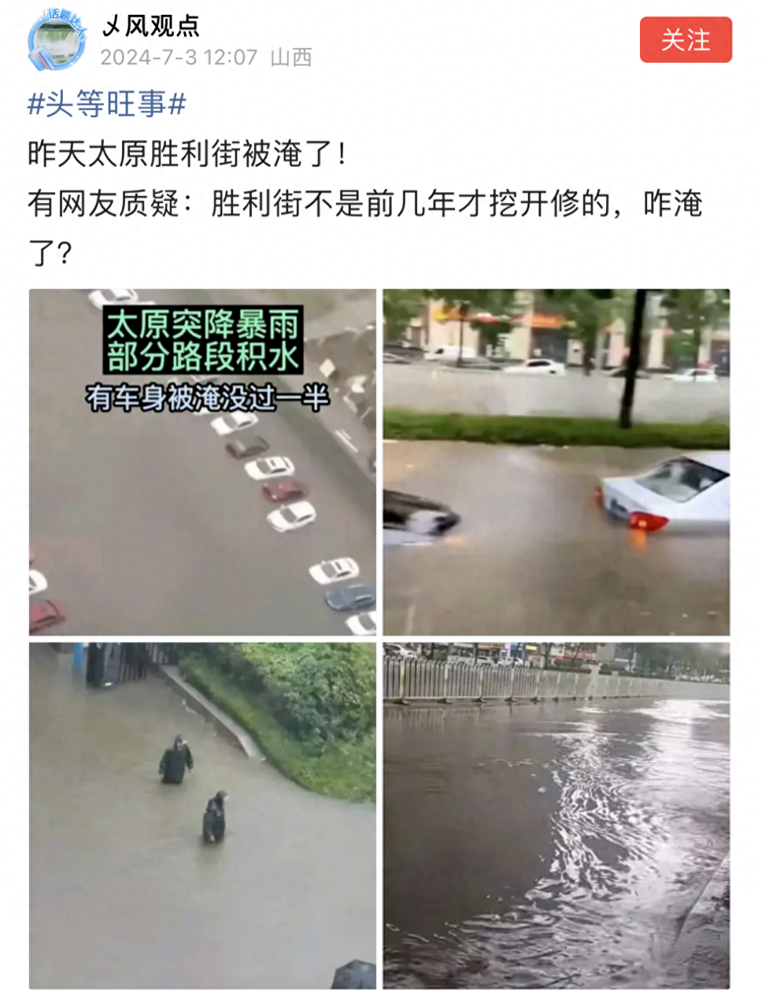 7月3日,网民“乄风观点”在今日头条平台发布信息称“昨天太原胜利街被淹了!”,并附4张图片。