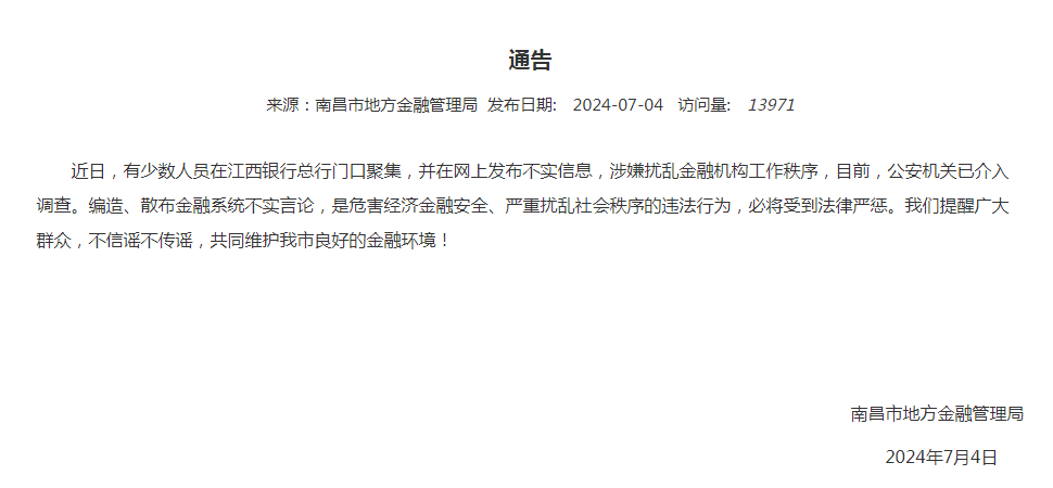 近日,有少数人员在江西银行总行门口聚集,并在网上发布不实信息,涉嫌扰乱金融机构工作秩序,目前,公安机关已介入调查。编造、散布金融系统不实言论,是危害经济金融安全、严重扰乱社会秩序的违法行为,必将受到法律严惩。我们提醒广大群众,不信谣不传谣,共同维护我市良好的金融环境!