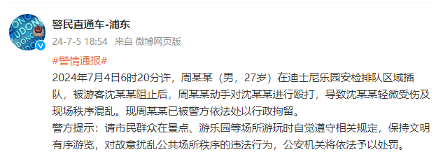 2024年7月4日6时20分许,周某某(男,27岁)在迪士尼乐园安检排队区域插队,被游客沈某某阻止后,周某某动手对沈某某进行殴打,导致沈某某轻微受伤及现场秩序混乱。现周某某已被警方依法处以行政拘留。