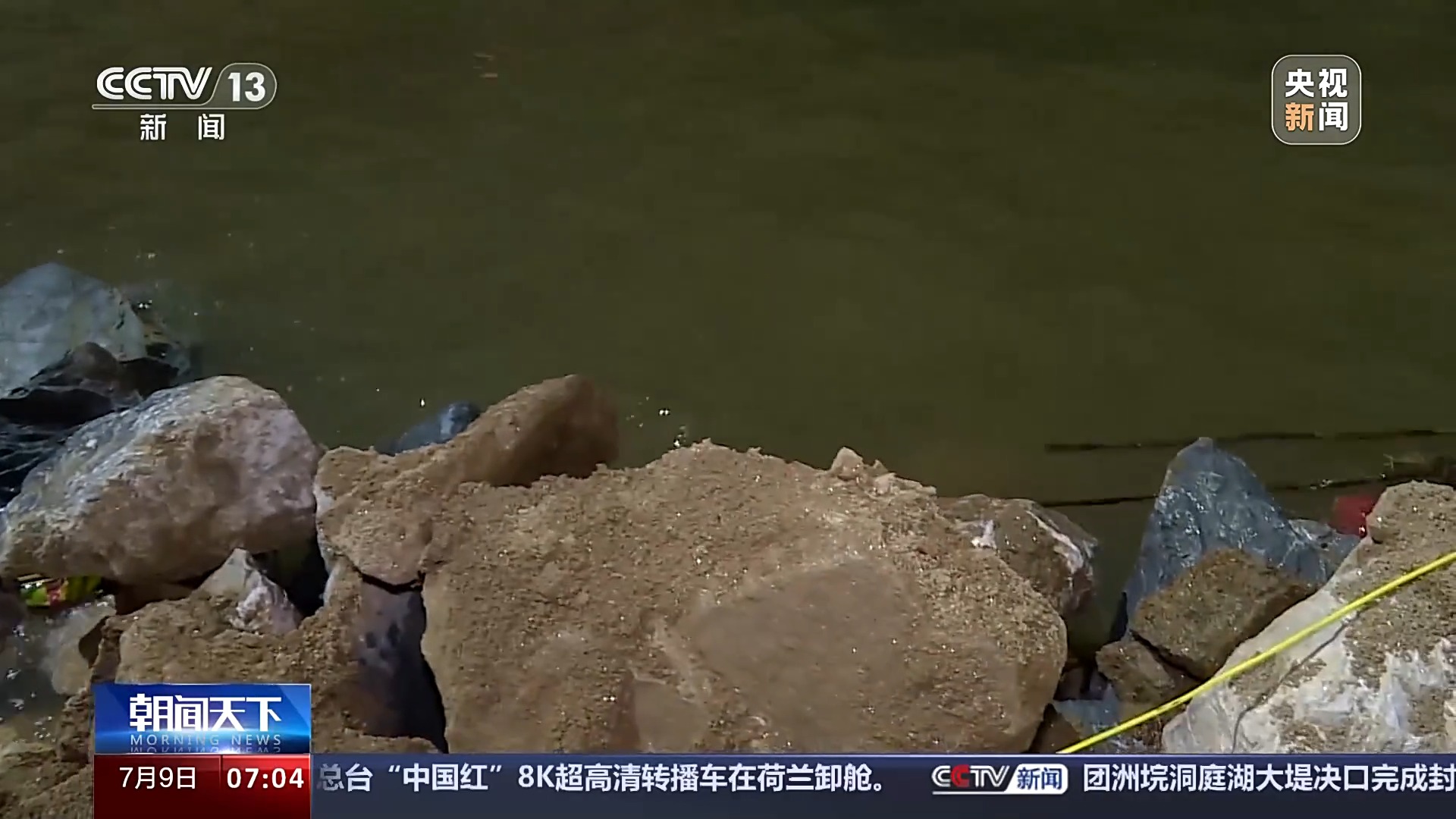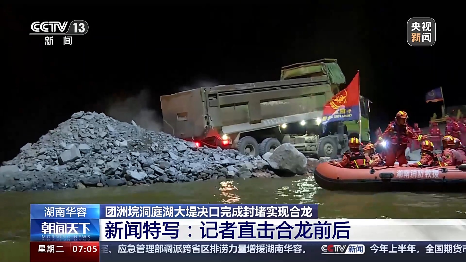 总台央视记者 张丛婧:我现在坐在一艘冲锋舟上,身后就是决口封堵现场。目前两个堤岸中间的距离只有十几米了,两侧卸石车正在同时作业。通往最后的大堤上,目前路上已经挤满了卸石车。
