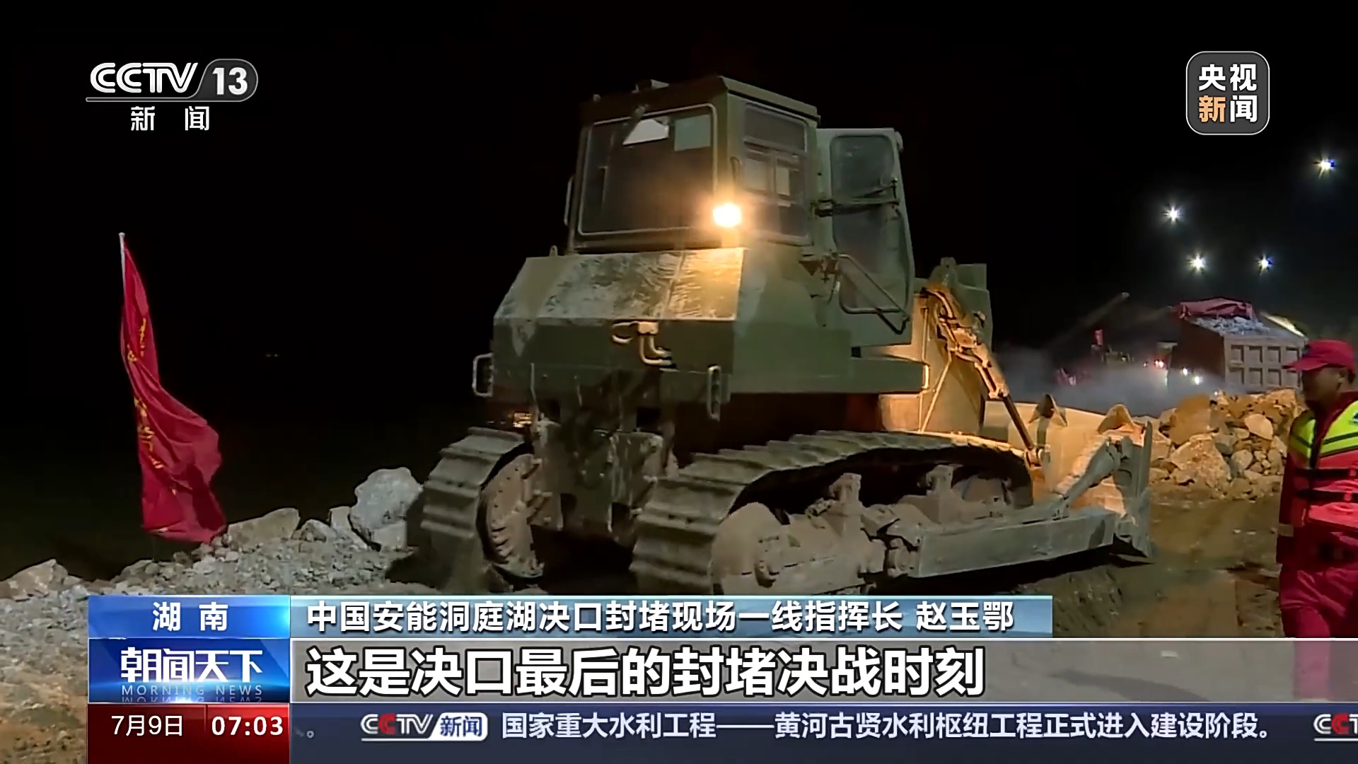 中国安能洞庭湖决口封堵现场一线指挥长 赵玉鄂:这是决口最后的封堵决战时刻,现在水流有点比较急,我们比较慎重地往前推进。