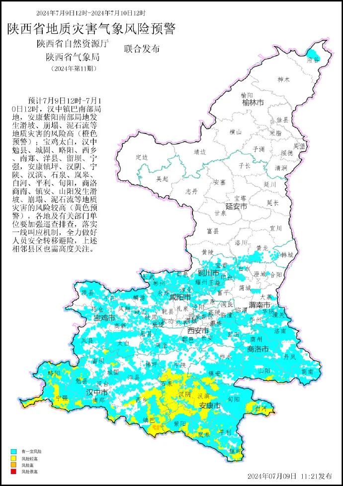 预计7月9日12时-7月10日12时,汉中镇巴南部局地,安康紫阳南部局地发生滑坡、崩塌、泥石流等地质灾害的风险高(橙色预警);宝鸡太白,汉中勉县、城固、略阳、西乡、南郑、洋县、留坝、宁强,安康镇坪、汉阴、宁陕、汉滨、石泉、岚皋、白河、平利、旬阳,商洛商南、镇安、山阳发生滑坡、崩塌、泥石流等地质灾害的风险较高(黄色预警),各地及有关部门单位要加强巡查排查,落实一线叫应机制,全力做好人员安全转移避险,上述相邻县区也需高度关注。