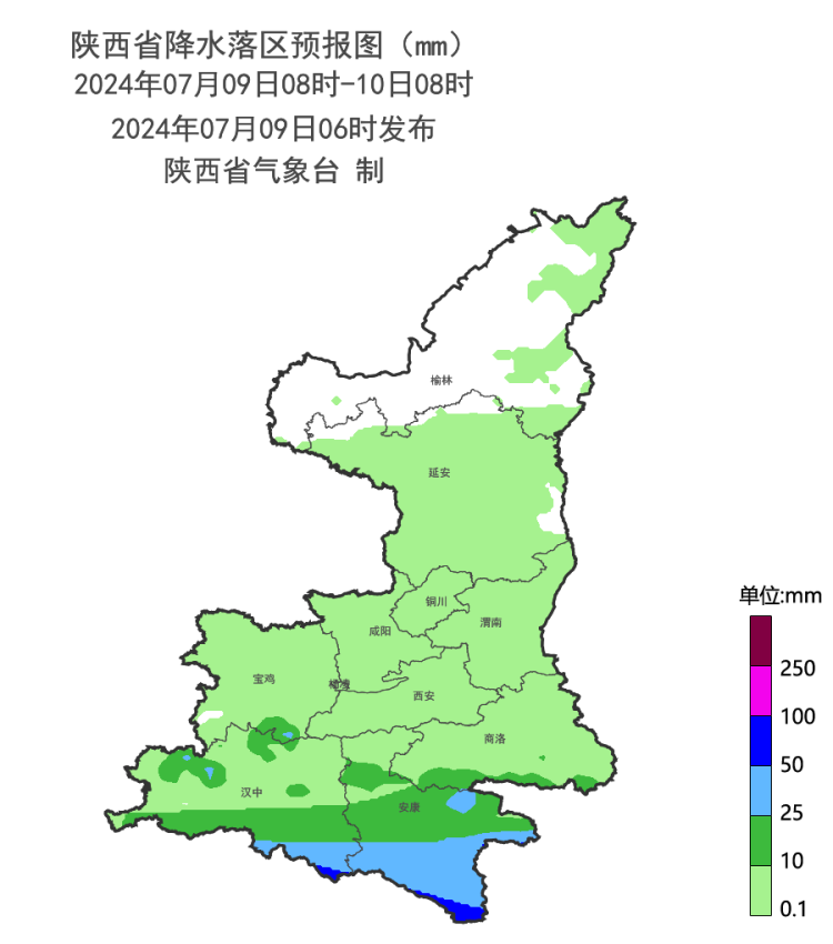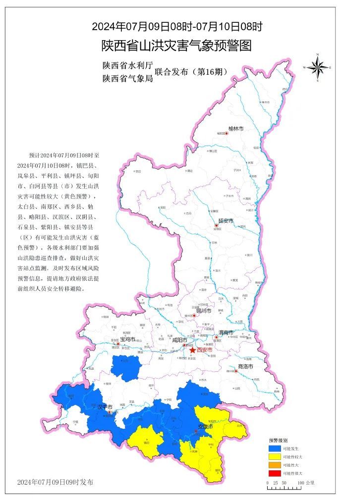 预计2024年07月09日08时至2024年07月10日08时,镇巴县、岚皋县、平利县、镇坪县、旬阳市、白河县等县(市)发生山洪灾害可能性较大(黄色预警),太白县、南郑区、西乡县、勉县、略阳县、汉滨区、汉阴县、石泉县、紫阳县、镇安县等县(区)有可能发生山洪灾害(蓝色预警),各级水利部门要加强山洪隐患巡查排查,做好山洪灾害站点监测,及时发布区域风险预警信息,提请地方政府依法提前组织人员安全转移避险。