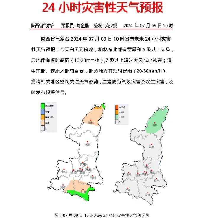 陕西省气象台2024年07月09日10时发布未来24小时灾害性天气预报:今天白天到傍晚,榆林东北部有雷暴和6级以上大风,局地伴有短时暴雨(10-20mm/h),7级以上短时大风或小冰雹;汉中东部、安康大部有雷暴,部分地方有短时暴雨(20-30mm/h)。提请相关地区密切关注天气形势,注意防范气象灾害及次生灾害,及时发布预警信号。