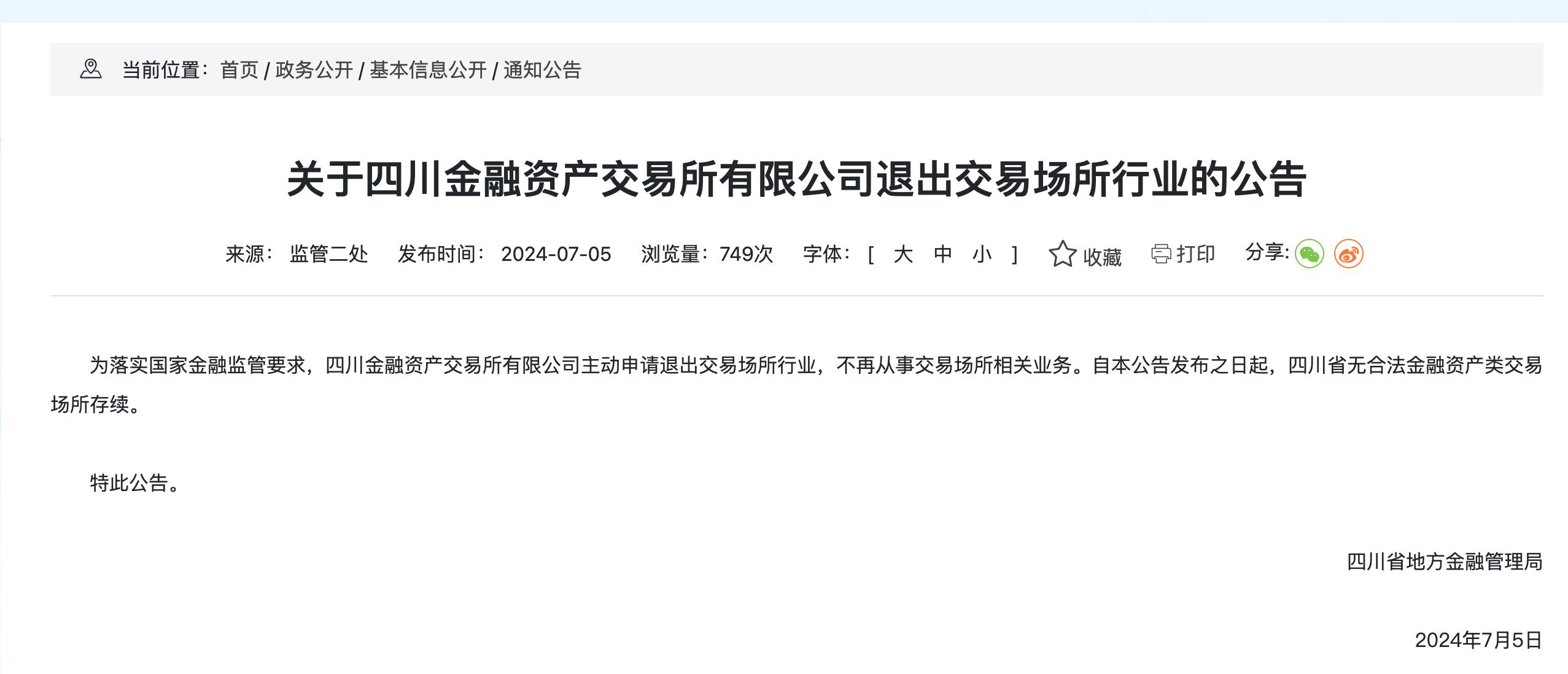 【环球网金融综合报道】7月5日,四川省地方金融管理局发布公告称,为落实国家金融监管要求,四川金融资产交易所有限公司主动申请退出交易场所行业,不再从事交易场所相关业务。自本公告发布之日起,四川省无合法金融资产类交易场所存续。