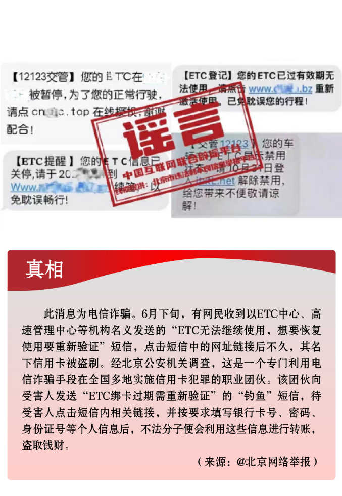 6月,暑期临近、旅游旺季将至,涉及旅游出行等谣言信息亦随之增多。谣言“去云南旅游每人补贴3169元”严重歪曲云南旅游政策,纯属虚假宣传、诱骗公众;谣言“ETC绑卡过期需重新验证”实为不法分子精心设计的诈骗“钓鱼短信”;谣言“珠峰无限期关闭”“商家为赚补胎钱在独库公路撒钉子”或误解误读、或歪曲炒作,引发公众对当地文旅业的担忧和困扰。