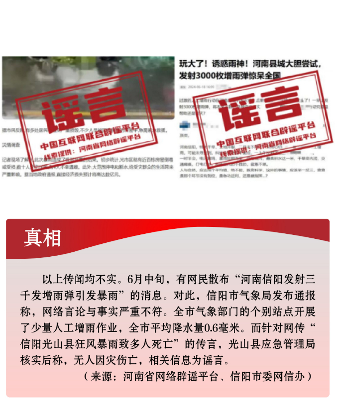 6月,随着我国多地全面入汛,因强降雨导致的洪水、内涝、泥石流等自然灾害频发,防汛救灾相关话题成为网络焦点。个别自媒体和网民为博眼球,借机编造或夸大灾情,干扰正常救灾秩序,引发公众焦虑恐慌。“河南郑州积水冲入地下车库”“长沙暴雨导致橘子洲头被淹、金盆岭烈士陵园坍塌”“桂林暴雨引发泥石流冲毁大量房屋”等谣言,或移花接木、旧闻翻炒,或捕风捉影、恶意编造,严重误导公众认知。“河南信阳发射三千发增雨弹引发暴雨”“信阳光山县狂风暴雨致多人死亡”“广西南宁市赛龙舟翻船致人员伤亡”等谣言,夸大其词、虚构致灾情况。另有杜撰灾难、铁路安全事故的谣言,如“重庆山林里惊现坠落飞机”“广州铁路局安监部2024年6月5日广茂线57139列车倾覆初步调查报告”等,纯属无中生有,造成恶劣影响。