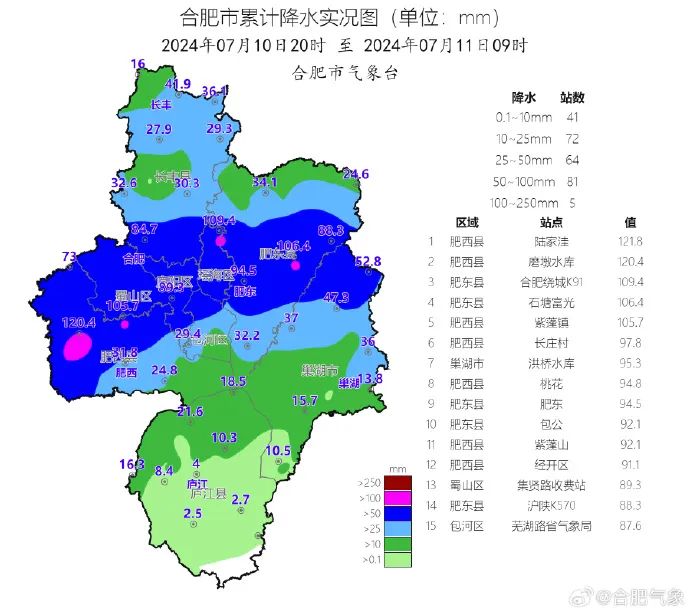 降雨及预警发布情况:昨夜20时至今日9时,全市累计降雨量(毫米):全市平均38,最大肥西陆家洼122;市区平均63,最大集贤路89。最大小时雨强市区三十头56毫米(5-6时)。全市共发布暴雨预警信号10条。