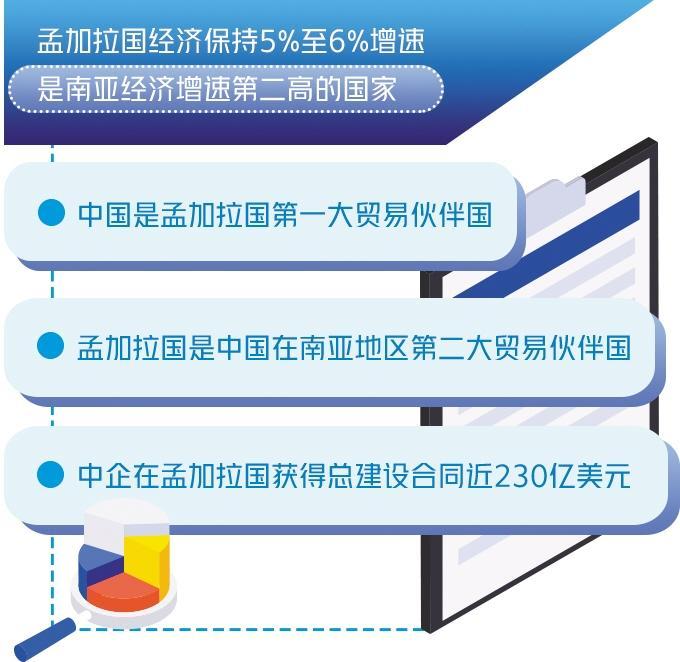 近年来,孟加拉国经济稳步增长,保持5%至6%的经济增速,是南亚经济增速第二高的国家。孟加拉国推行私有化政策,改善投资环境,大力吸引外商投资,积极创建出口加工区。中国是孟加拉国第一大贸易伙伴国,孟加拉国是中国在南亚地区第二大贸易伙伴国。两国在纺织服装、路桥建设、能源、农业等领域合作基础深厚,在基建设施、食品加工、产业园等领域合作潜力巨大,双边经贸关系展现出强劲的发展势头。