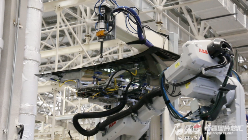 6月24日,在广汽乘用车有限公司新疆分公司总装车间涂胶工位,机器人负责精确控制风挡玻璃的位置,而上方的供胶枪则精确在相应位置进行涂胶。资料图