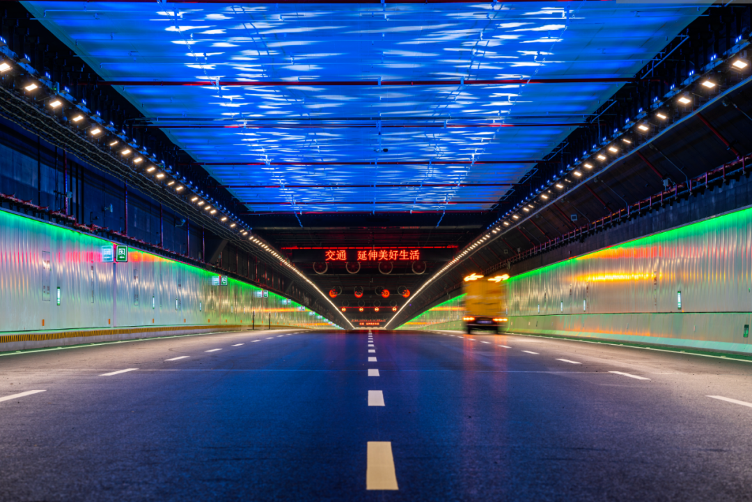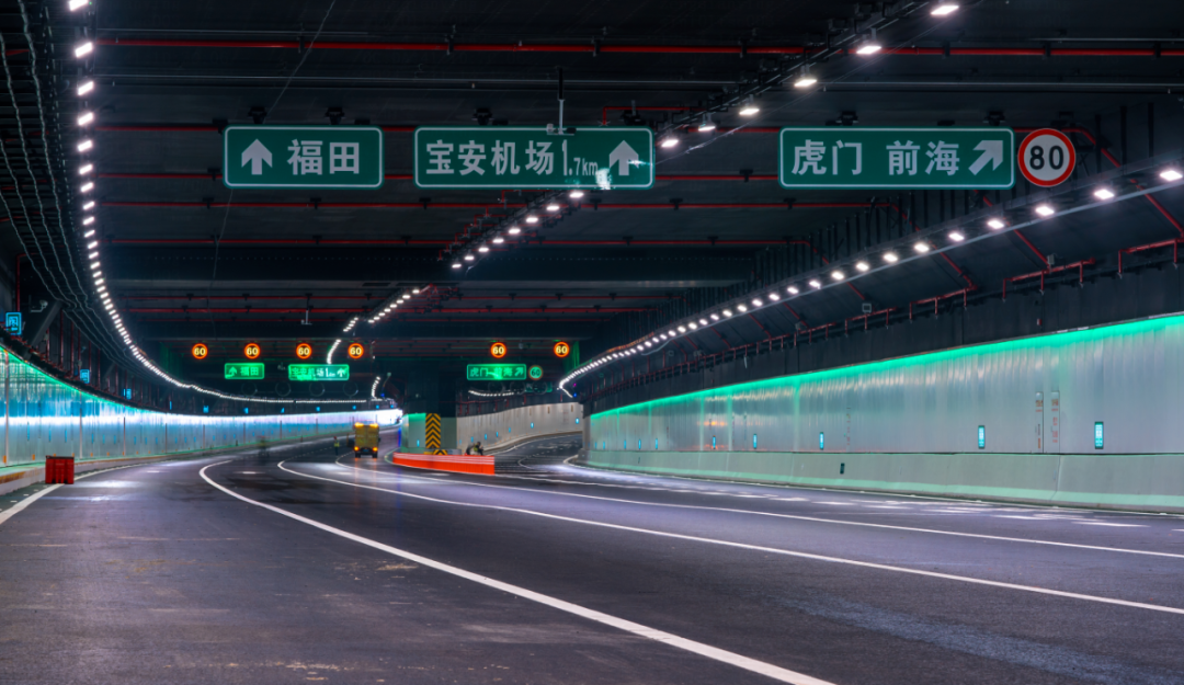 深中通道照明分为道路照明和景观照明两部分,其中,深中通道海底隧道两侧布有可智能调节的全彩景观灯带,可以根据环境温度、车流状况变色。