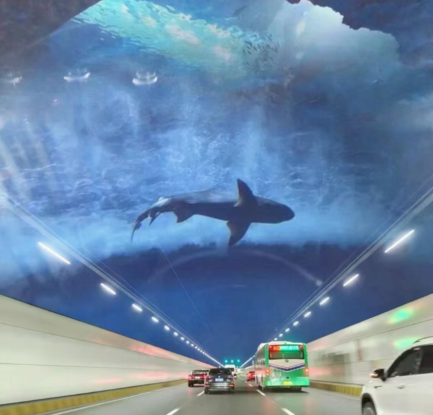 除了景观灯带,海底隧道中段采用投光灯的形式,将一些图案投影到隧道顶部,长度约为150米,主要用于缓解驾驶员的行车疲劳。