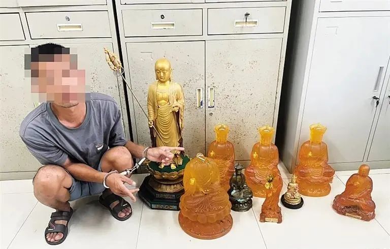 一男子在夜间盗走寺庙的10尊佛像,并将它们藏在附近,当其再次准备行窃时,没想到被当场逮住。