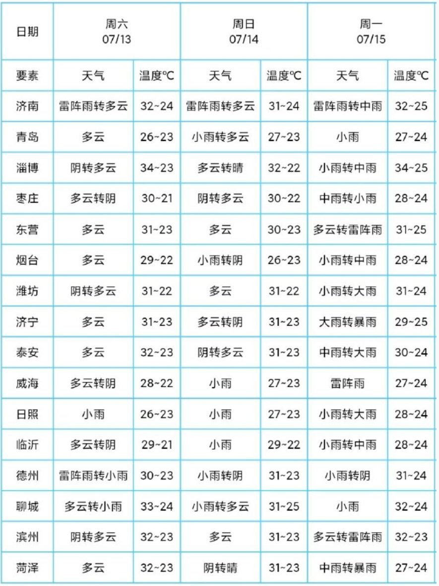 13日下午到14日白天,鲁西北和鲁中地区天气多云间阴局部有雷雨或阵雨,半岛地区天气多云间阴局部有小雨,其他地区天气多云。鲁西北地区北风3~4级,半岛地区南风转北风3~4级,其他地区南风3~4级,雷雨地区雷雨时阵风8~10级。最低气温:鲁中山区和半岛内陆地区19℃左右,其他地区22℃左右。14日最高气温:鲁西北地区32℃左右,南部沿海地区26℃左右,其他地区30℃左右。