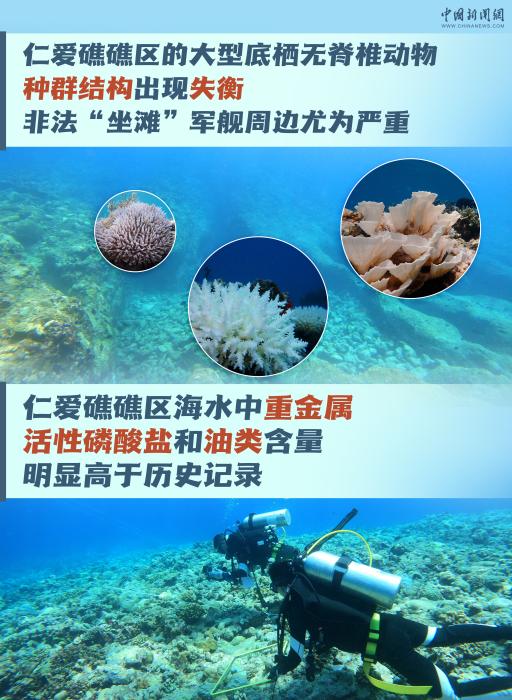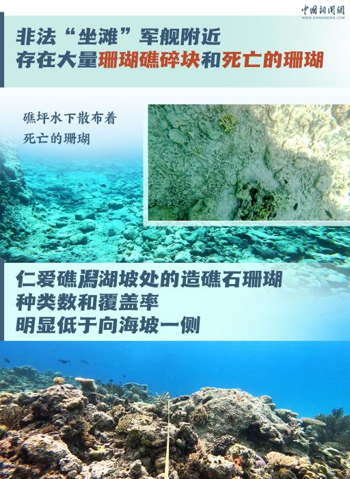 图文来源:《黄岩岛海域生态环境状况调查评估报告》《仁爱礁非法“坐滩”军舰破坏珊瑚礁生态系统调查报告》